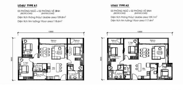 Căn 3 phòng ngủ : diện tích 102m2, 118m2