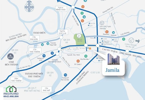 Jamila dễ dàng kết nối đến Trung tâm Quận 1, Quận 2, Quận 7 và vùng lân cận chỉ trong vài phút di chuyển. Đặc biệt, vị trí chiến lược tại Jamila giúp thuận tiện di chuyển đến đến các vùng tiện ích lân cận: Đại học Fullbright, Bệnh viện, khu công nghệ cao Saigon Samsung, TTTM, siêu thị, v.v… cho cuộc sống tiện nghi bậc nhất.